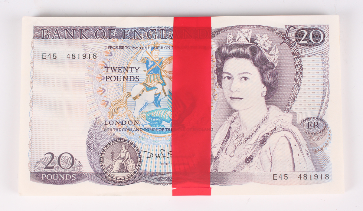 A scarce consecutive run of forty-four Elizabeth II Bank of England twenty pounds notes, Shakespeare-type, Chief Cashier D.H.F. Somerset, serial numbers E45 481918 to E45 481962 (uncirculated, some light soiling), with red tape band.