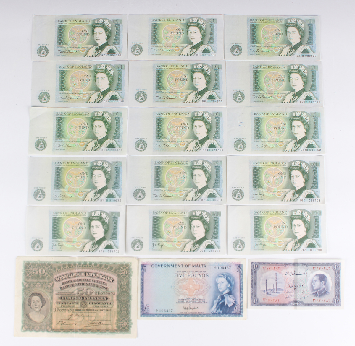 A large collection of European and world banknotes, including a collection of Elizabeth II one pound notes, a Switzerland National Bank fifty francs note, dated 1942, an Elizabeth II Government of Malta five pounds note and a Bank Melli Iran ten rials note (fair-uncirculated throughout).