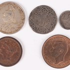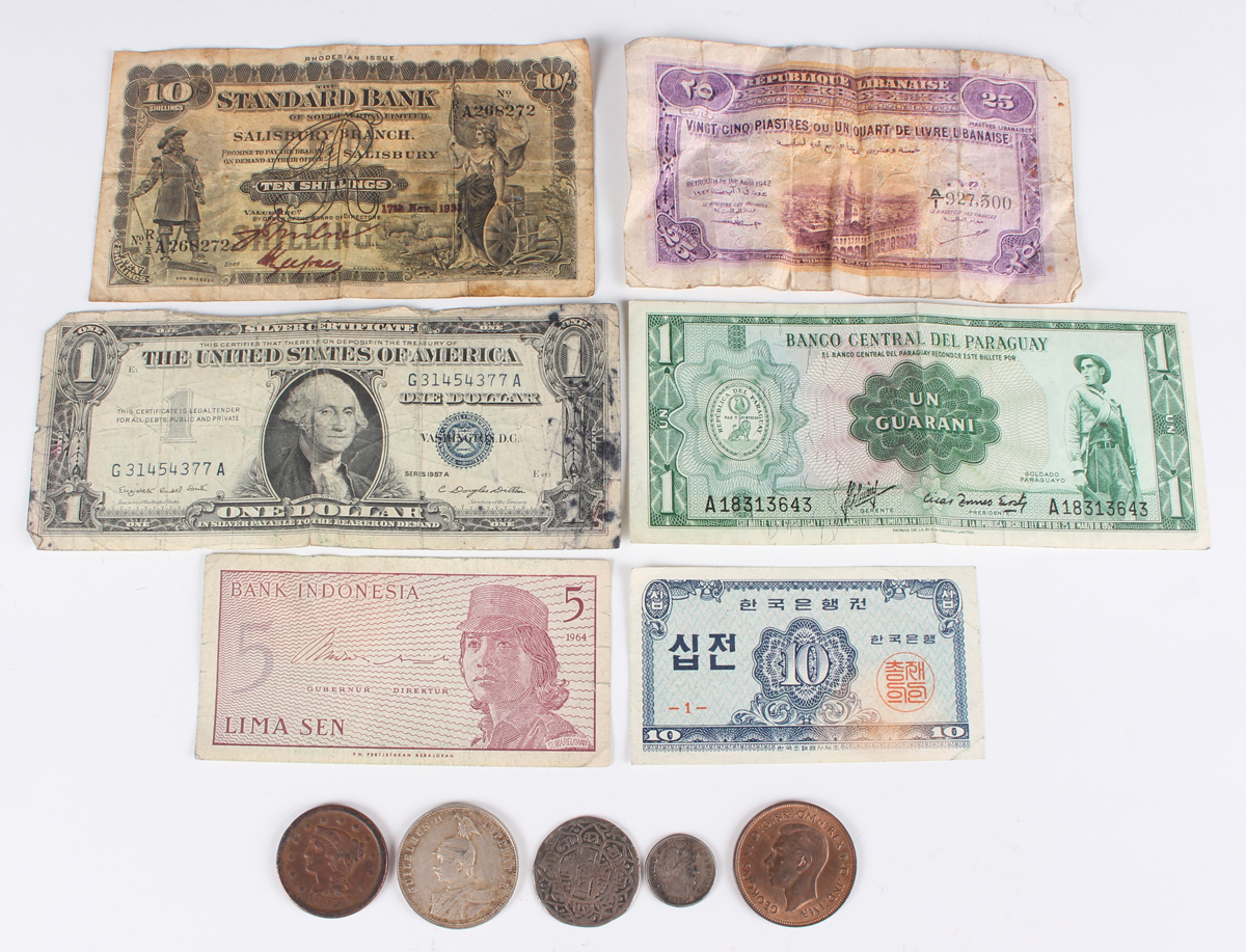 A scarce Standard Bank of South Africa Limited Rhodesia issue ten shillings banknote, Salisbury Branch, dated 17th November 1933, serial number A 268272 (fair-good), together with a small group of other banknotes and coins, including a German East Africa one rupie 1914, mintmark J.