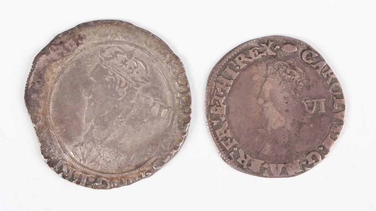 A Charles I hammered silver sixpence 1625-1649, mintmark tun, Tower Mint, together with a Charles I hammered shilling.