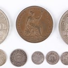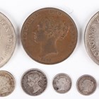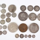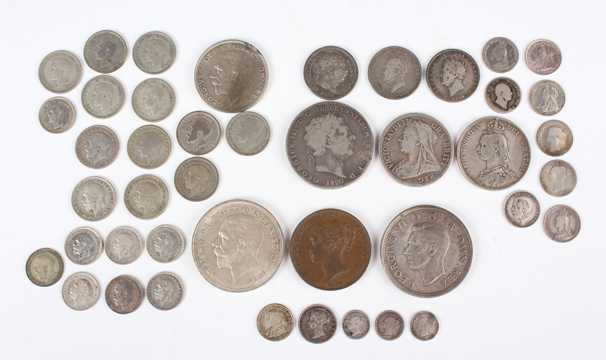 A collection of mainly British coinage, including a George III crown 1820, a Victoria Young Head penny 1859, a George V crown 1835 and a George VI crown 1937.