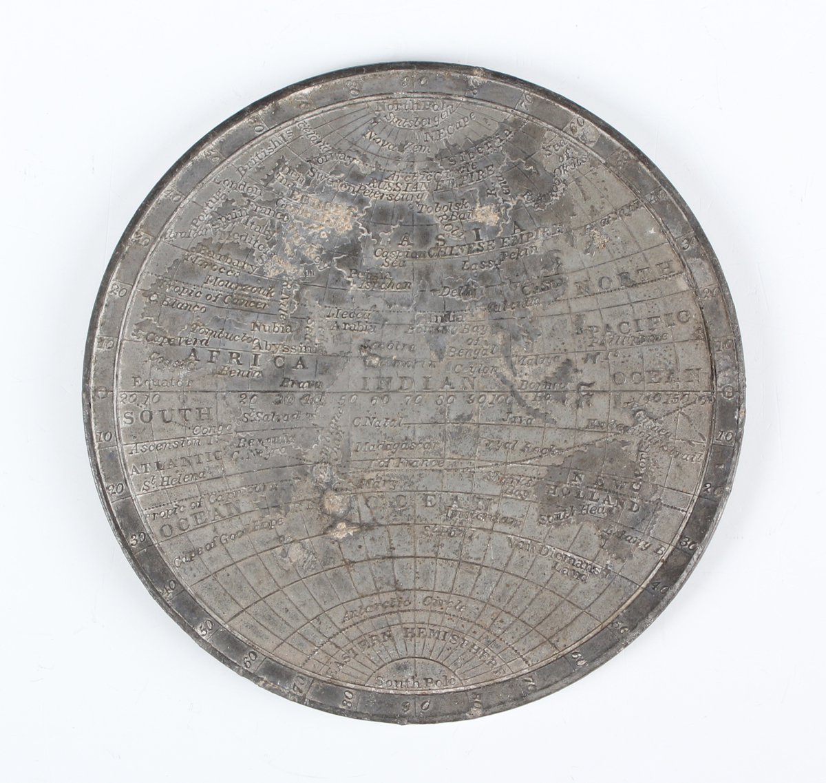 An early 19th century Map of the World white metal medallion, one side detailed with the Eastern Hemisphere, the other with the Western Hemisphere, probably struck by T. Halliday, diameter 74mm, Eimer 1139a (good-fine, some discolouration, particularly to one side).