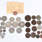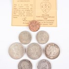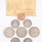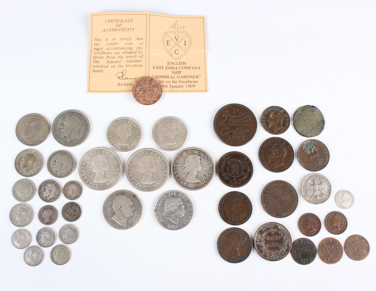 A small collection of British and world coinage, including a George III half-crown 1817, a William IV half-crown 1836, three Canada dollars, comprising 1959 and two 1962, and an East India Company ten cash 1808, salvaged from the wreck of the Admiral Gardner on the Goodwin Sands.