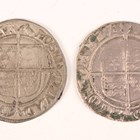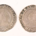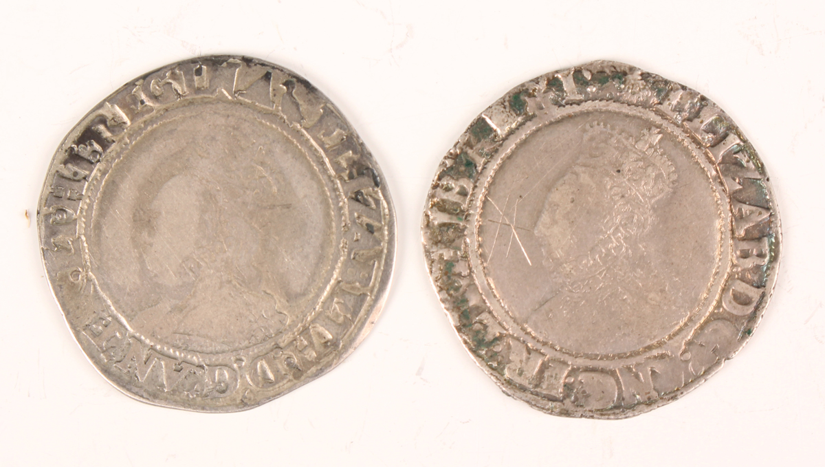 Two Elizabeth I hammered silver shillings, comprising second issue 1560-1, mintmark martlet, and sixth issue 1584-6, mintmark escallop (the latter removed from a mount, some edge solder remaining, some graffiti to field at front of face).