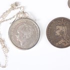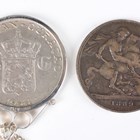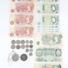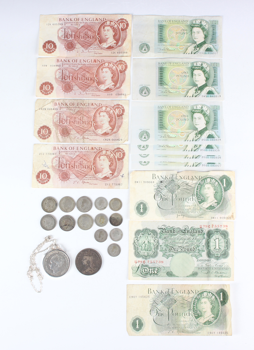 A collection of British coins and banknotes, including a Victoria Jubilee Head crown 1889 and a Britannia-type green one pound note, Chief Cashier P.S. Beale, serial number U79C 755738, together with a Netherlands two-and-a-half gulden 1944, cushion-mounted with suspension chain.
