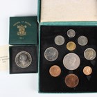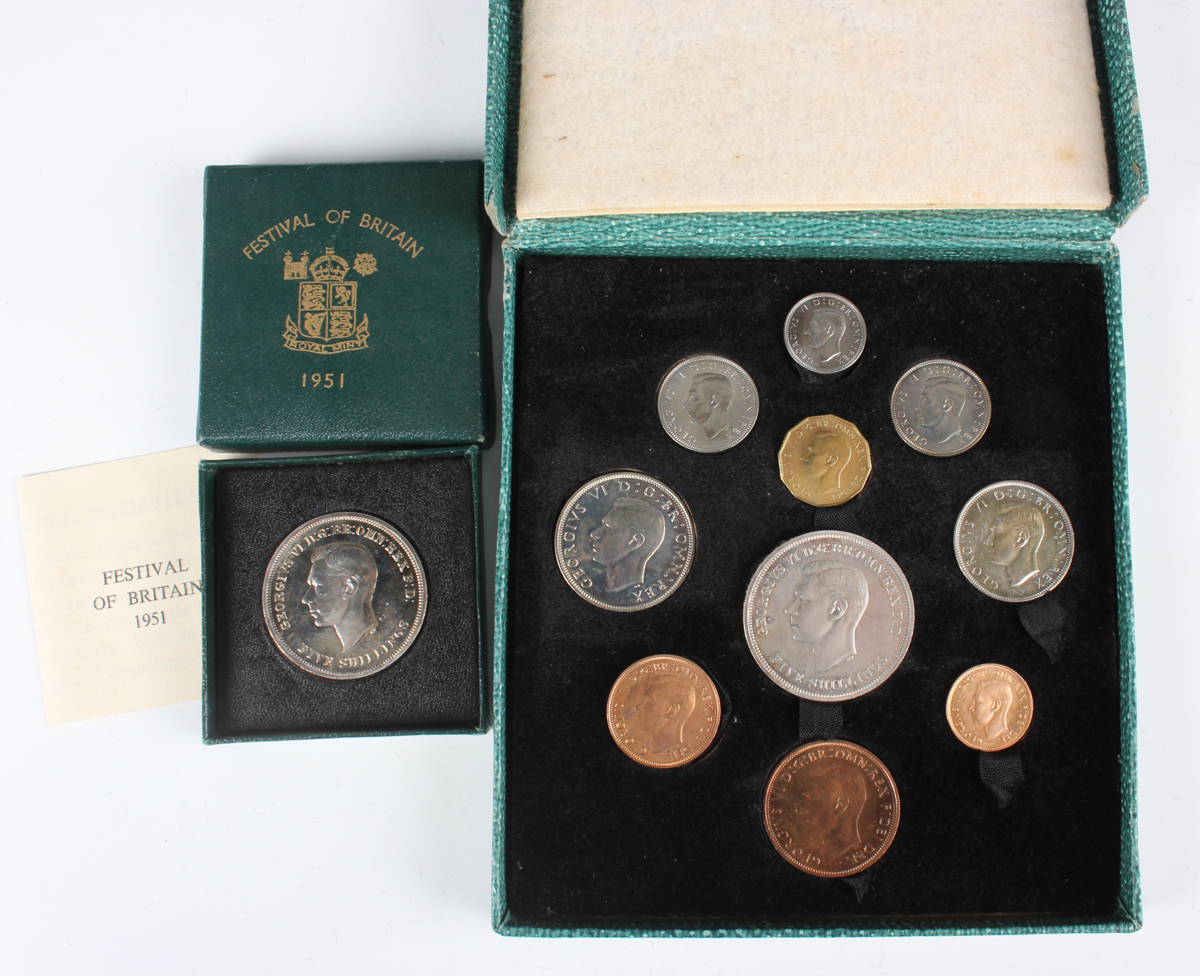 A George VI Festival of Britain ten-coin commemorative set 1951, comprising crown, half-crown, two shillings, English shilling, Scottish shilling, sixpence, threepence, penny, halfpenny and farthing (uncirculated, lustrous), with original mottled blue/green card presentation case, together with another Festival of Britain crown 1951, cased.