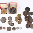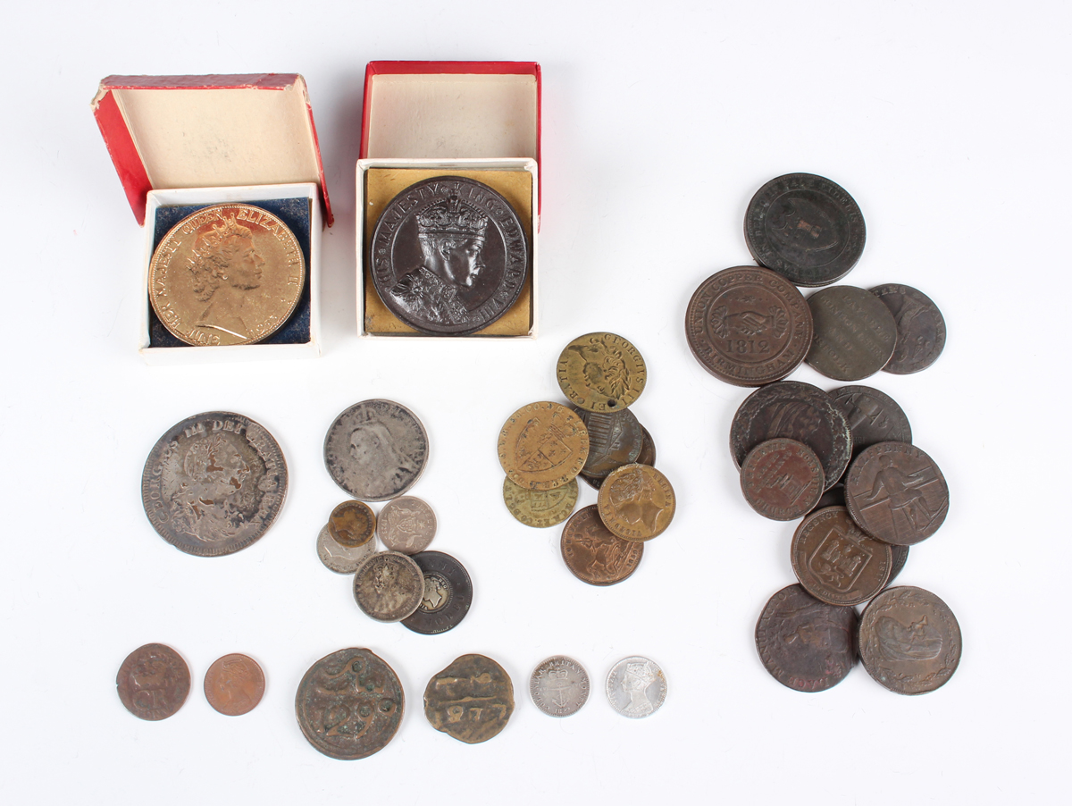A collection of 18th and 19th century tokens, including a Rochdale halfpenny 1791 and a Birmingham Union Copper Company penny 1812, together with a small group of coins and paranumismatic items, including a Scotland Charles I copper turner, a Victoria model penny and a plated George III contemporary forgery Bank of England dollar, dated 1804.