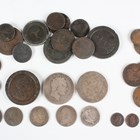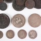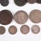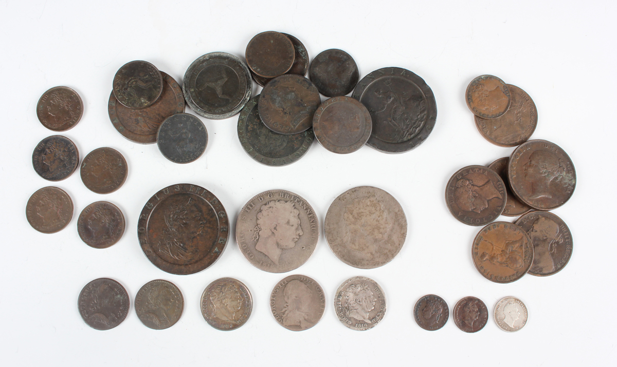 A collection of 18th and 19th century silver and copper coinage, including two George III crowns, one dated 1818, a George III cartwheel twopence 1797 and a George III shilling 1817.