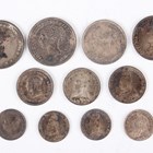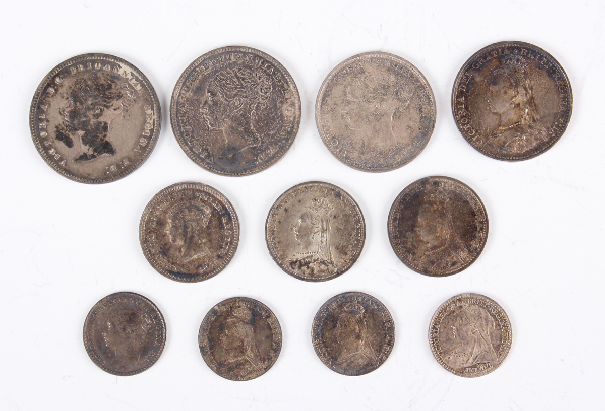 A collection of mixed Victorian Maundy money, including a Young Head fourpence 1885, a Young Head twopence 1887, a Jubilee Head twopence 1888, a Young Head penny 1853 and a Jubilee Head penny 1888.