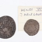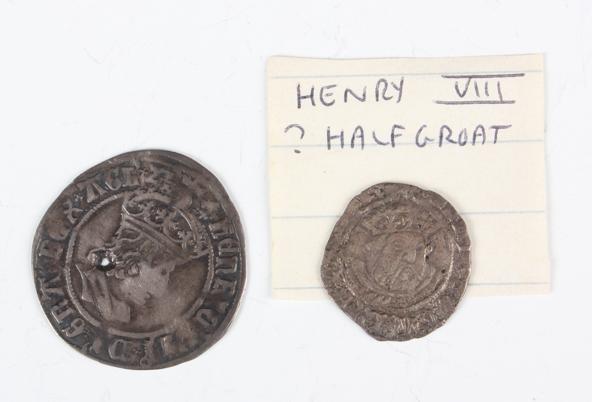 A Henry VII hammered silver groat 1485-1509, side profile portrait, mintmark cross-crosslet (pierced to back of bust), together with a Henry VIII posthumous issue half-groat, three-quarter facing bust, Canterbury Mint.