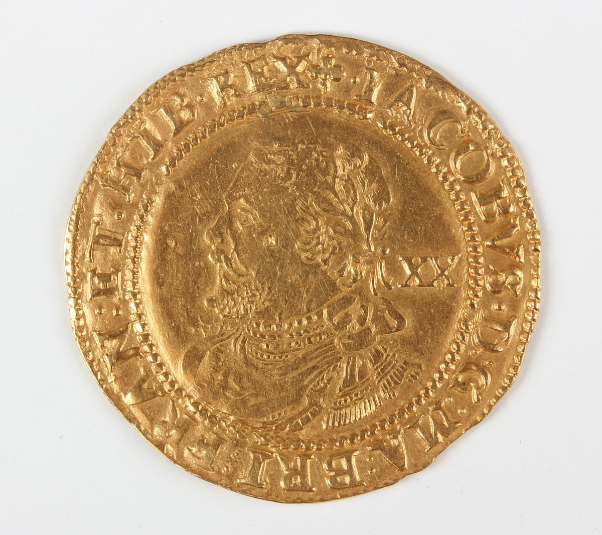 A James I hammered gold laurel, fourth head type with small ties to hair, mintmark trefoil, Sp 26386 (marked to face, evidence of plug repair above king's head within field, otherwise good-very fine).