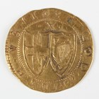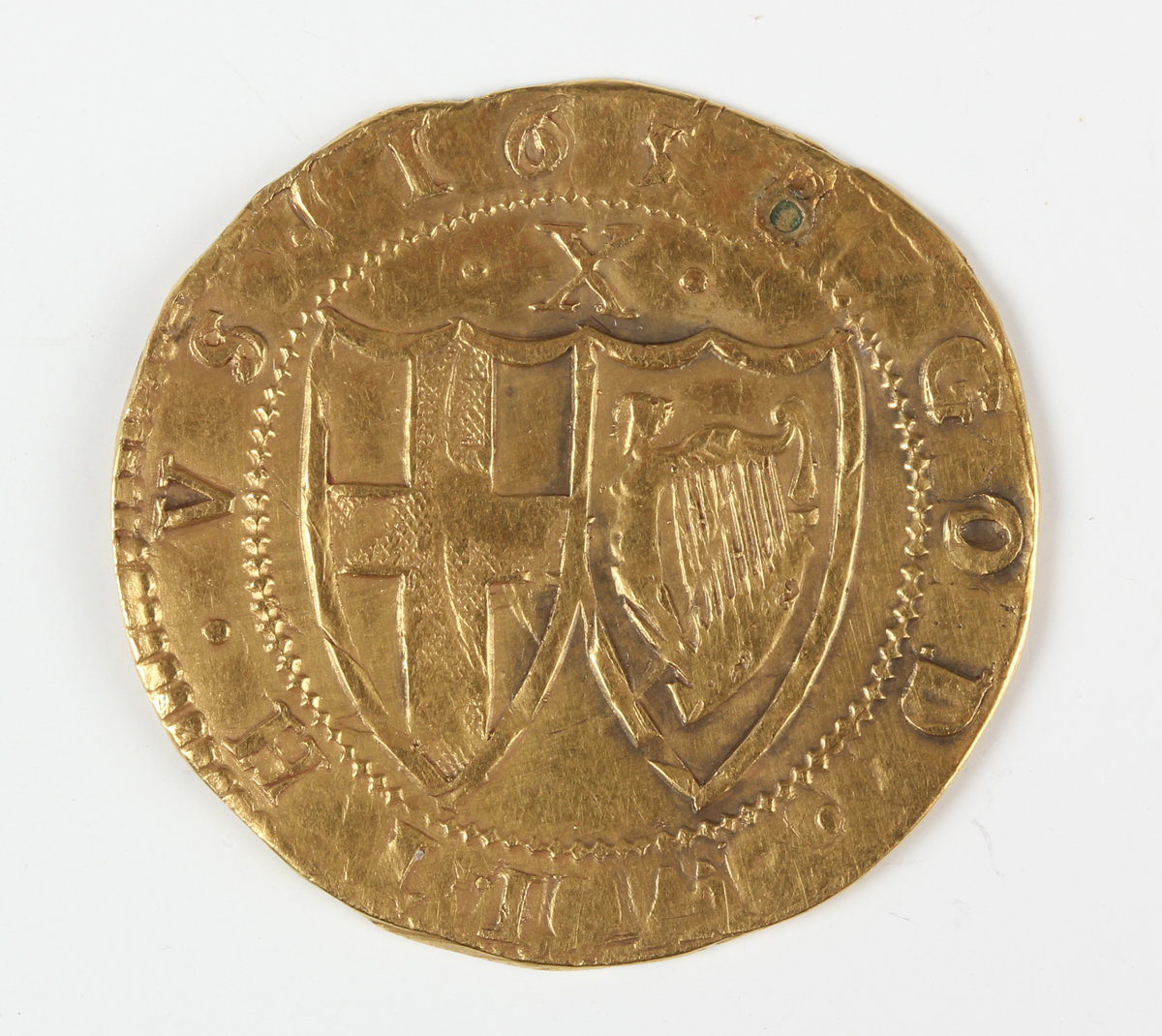 A scarce Commonwealth hammered gold double-crown 1658?, probably a double-strike or overdate, with value above double shields and border legend 'God with us', mintmark anchor, Sp 3210 (an unusual anomaly with date).