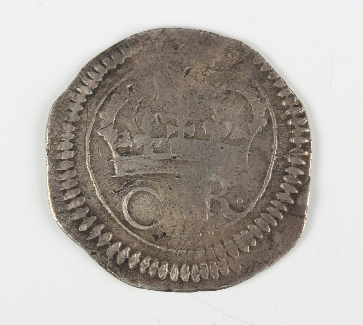 A Charles I Ormonde Money shilling 1625-1649, obverse with crowned 'CR', reverse with value, weight 5.2g (some irregularity to flan as expected, some slight porosity to surface with some stable fatigue).