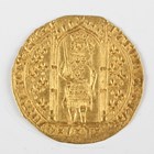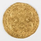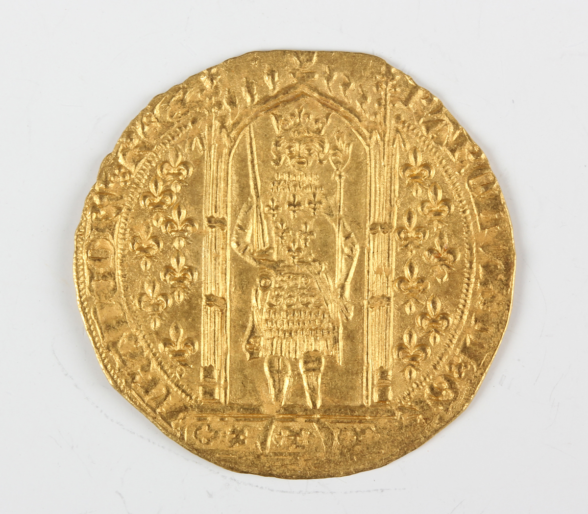 A Charles V of France hammered gold franc à pied 1364-1380, obverse with King standing within gothic arch or canopy holding sword in his right hand and Hand of Justice in his left, reverse with angled quatrefoil pellet to centre, crowns and fleurs to angles, Paris Mint, weight 3.6g (extremely fine with good eye-appeal).