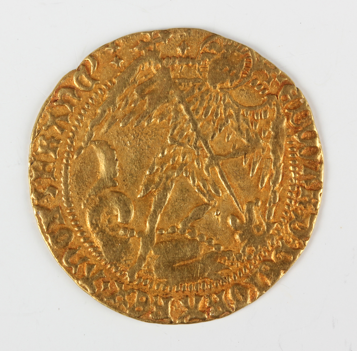 An Edward IV hammered gold angel 1471-1483, mintmark pierced cross, London Mint, Sp 2091, weight 5g (good-very fine, probably struck from a rusty die, old cabinet tone).