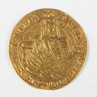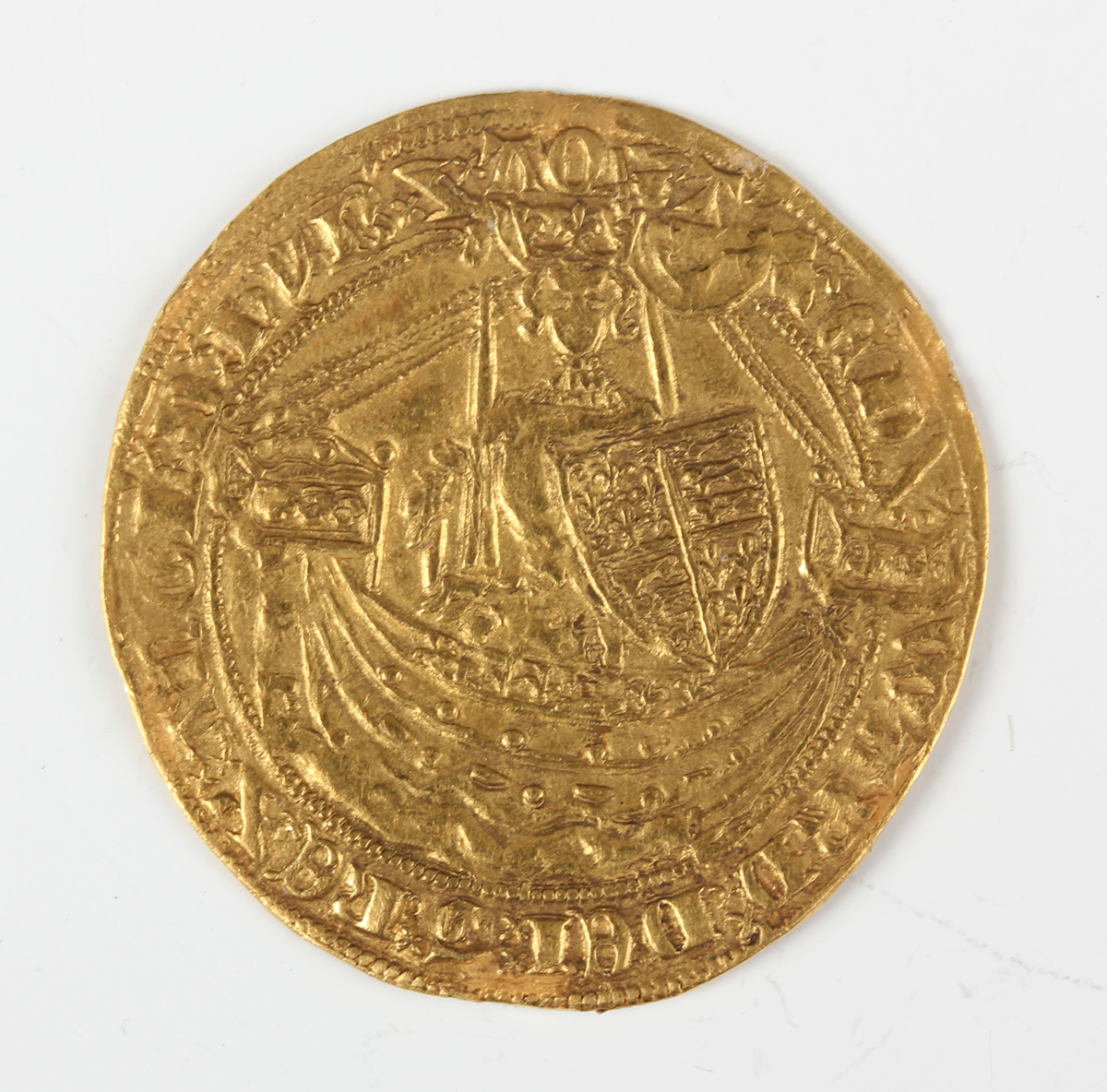 An Edward III hammered gold half-noble 1327-1377, fourth coinage, Treaty period, saltire before Edward, mintmark cross, London Mint, Sp 1506, weight 3.8g (good-very fine on a nice full flan).