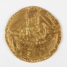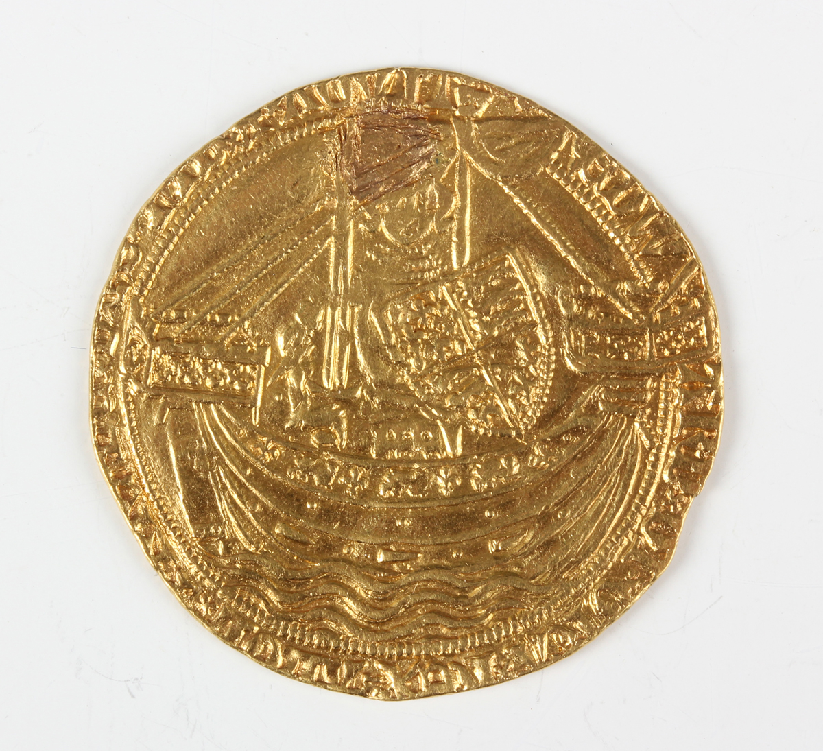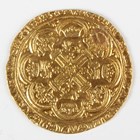 An Edward III hammered gold noble 1327-1377, post-Treaty period 1369-1377, 'E' and pellet to centre, Sp 1521, weight 6.7g (heavily clipped and at some point a touchpiece, plugged hole to field and poorly repaired).