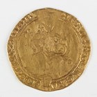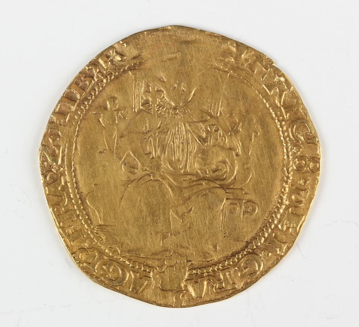 A Henry VIII half-sovereign 1547-1551, posthumous coinage, obverse with King seated facing in throne, reverse with shield of arms with lion and dragon supporters, 'K' below, no mintmark, Sp 2392, weight 5.5g (fair-fine, generally even wear but with some detail to king's upper body and facial areas).