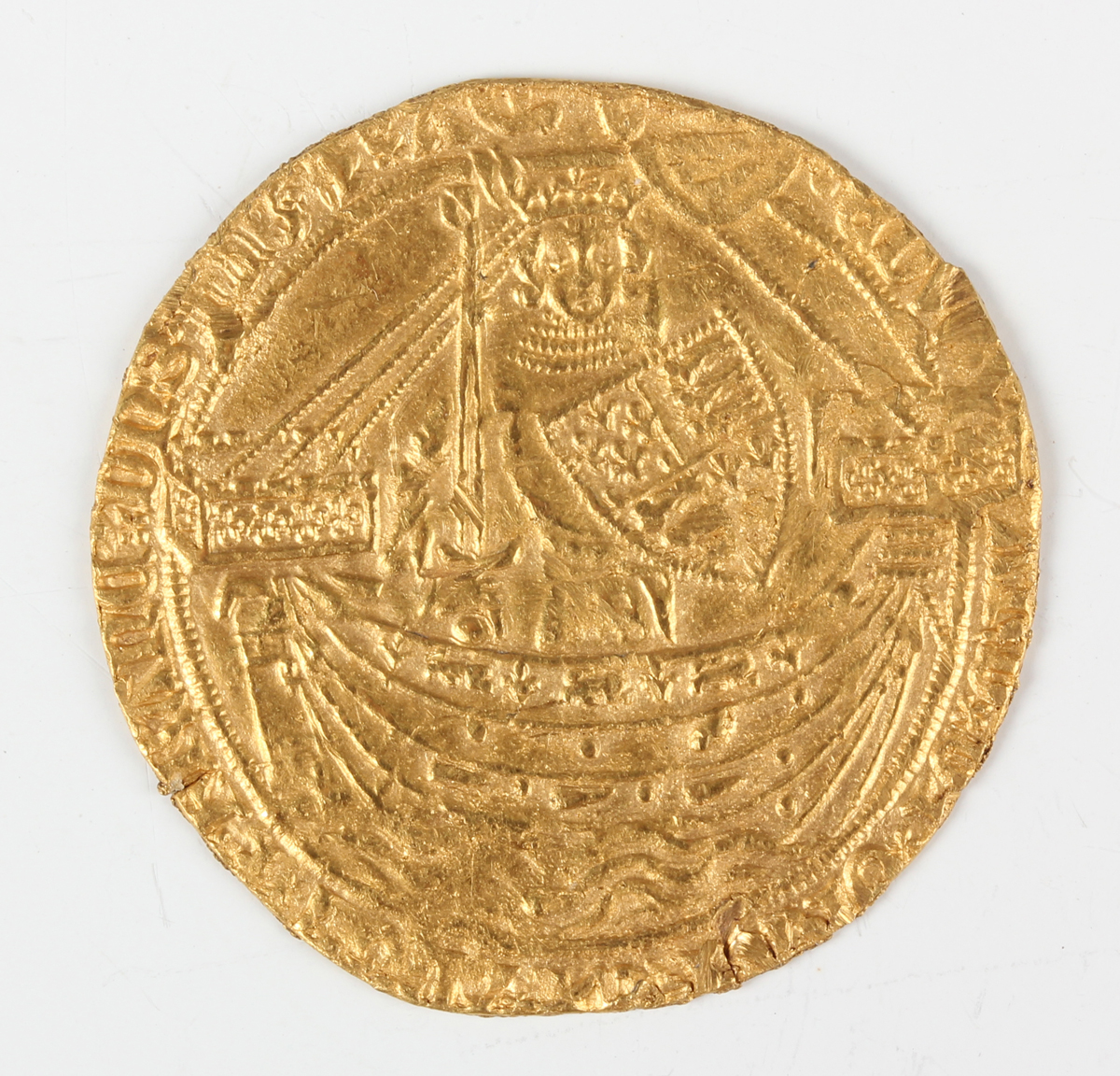 An Edward III gold noble 1369-1377, post-Treaty period, saltire stops, reverse with 'E' and pellet to centre, mintmark cross, London Mint, weight 6.9g (good-fine, scrapes and scuffs from burial, some dressing, small split to flan at 6 o'clock).