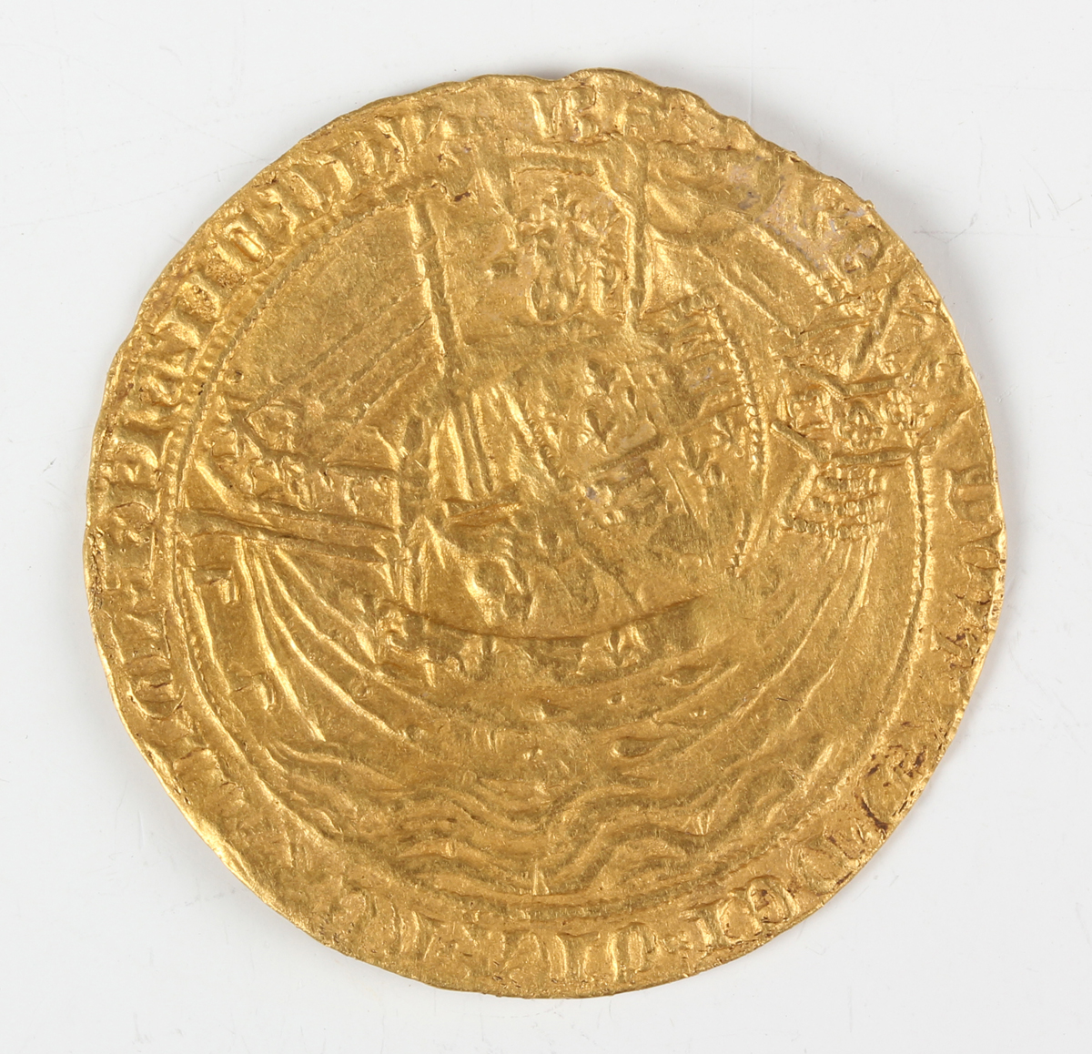 An Edward III gold noble 1327-1377, pre-Treaty period, saltire stops to both sides, pellets either side of upper lis on reverse, mintmark cross, London Mint, weight 7.6g (good-fine, possible tooling above stern of ship).