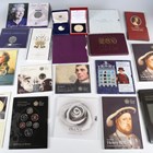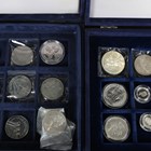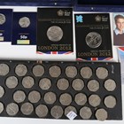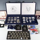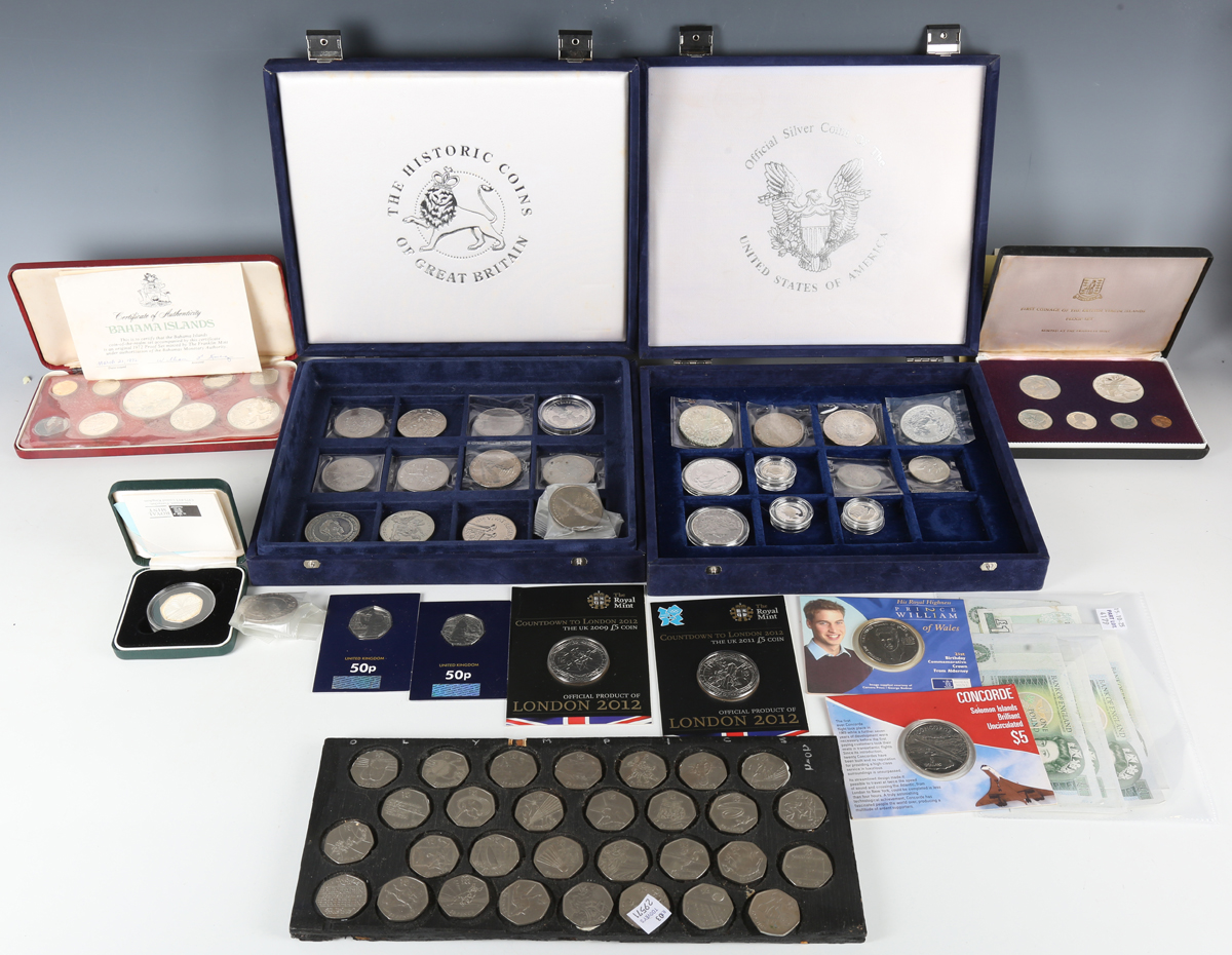 A large collection of silver and base metal commemorative and other coinage, including two USA Morgan dollars, 1882 and 1886, two Elizabeth II one-ounce silver Britannia coins, 1998 and 1999, a restruck Maria Theresa thaler, dated 1780, a collection of base metal Olympic fifty pence commemorative coins, mounted on a board, and a group of five pounds coins, together with a small collection of British one pound banknotes (circulated).