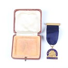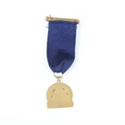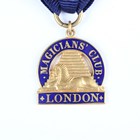 A rare early 20th century gilt and enamelled Magicians' Club London member's medallion, detailed to the centre with a design of an Egyptian sphinx and pyramid, suspended on a blue ribbon with brooch clasp.