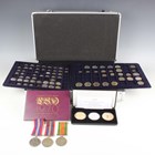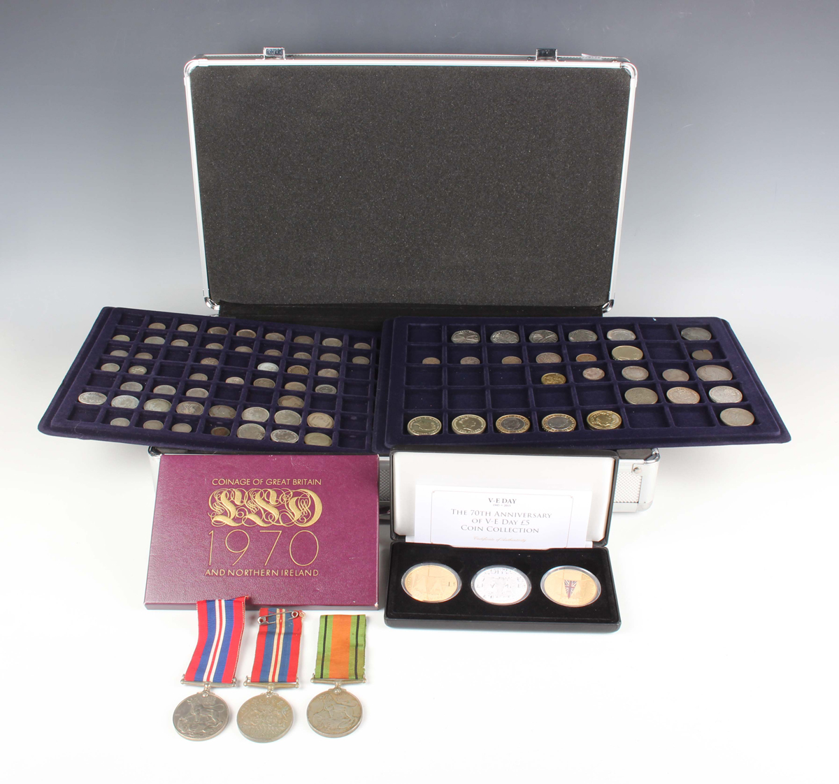 A collection of mixed British and other coins, including a group of 19th and 20th century silver and silver nickel coinage, part within an aluminium-covered carry case with fitted interior, and a Jubilee Mint silver and silver gilt five pounds three-coin set 2015 commemorating the 70th Anniversary of V-E Day, cased with certificate.