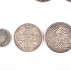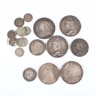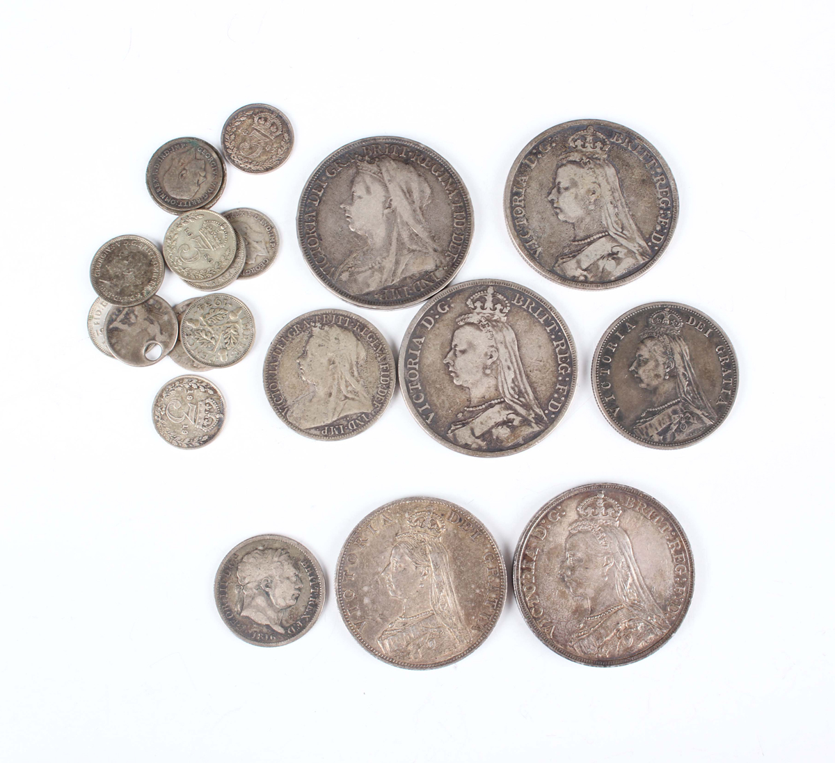 A collection of George III and later silver and silver nickel coinage, including a Victoria Jubilee Head crown 1889, a Victoria Jubilee Head double florin 1887 and a George III shilling 1816.