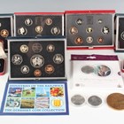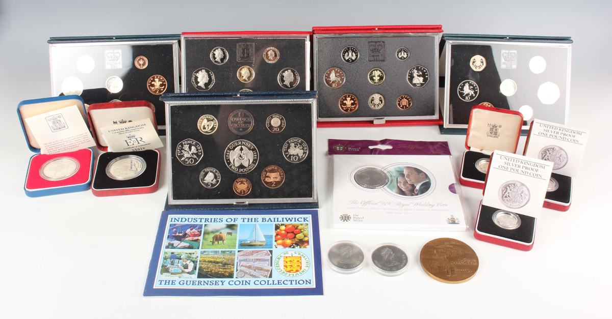 A collection of Royal Mint and other commemorative coins and coin sets, including five year-type specimen sets, an Elizabeth II silver proof crown 1977 and an Elizabeth II silver proof crown 1993 commemorating the Coronation 40th Anniversary, most cased with certificates.