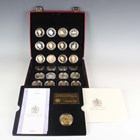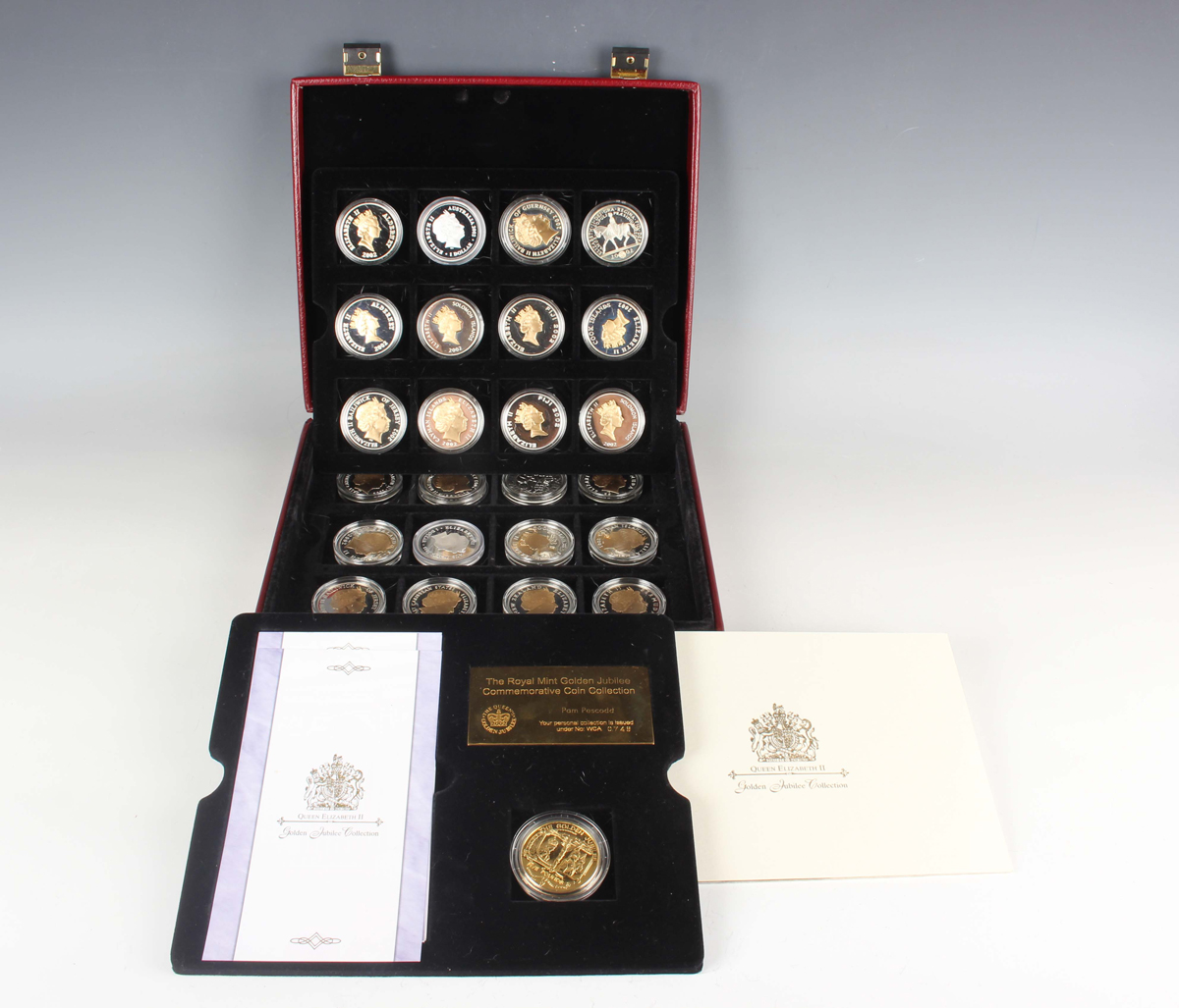 A collection of Royal Mint and other commemorative coins, including a Royal Mint Golden Jubilee Collection twenty-five coin set, comprising mainly silver but also base metal crown-size coins, deluxe-cased with certificates, and a Westminster Coronation Collection silver proof fifty pence twelve-coin set, cased with certificates.