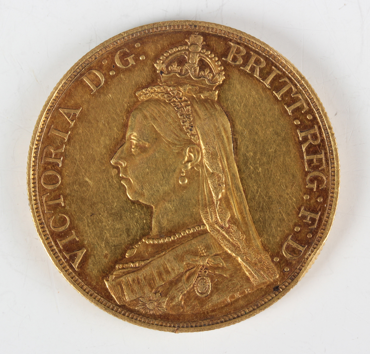 A Victoria Jubilee Head gold five pounds 1887 (edge bruise obverse at 4 o'clock, otherwise good-very fine, toned).