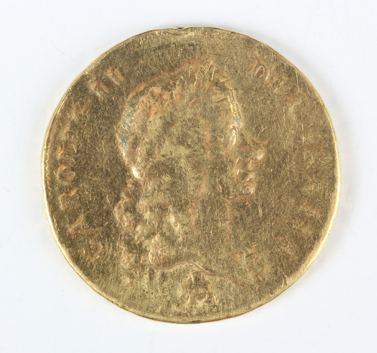 A Charles II gold five guineas 1678, elephant and castle below bust (heavily worn, previously mounted, probably as a touchpiece).