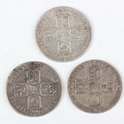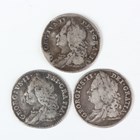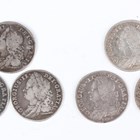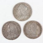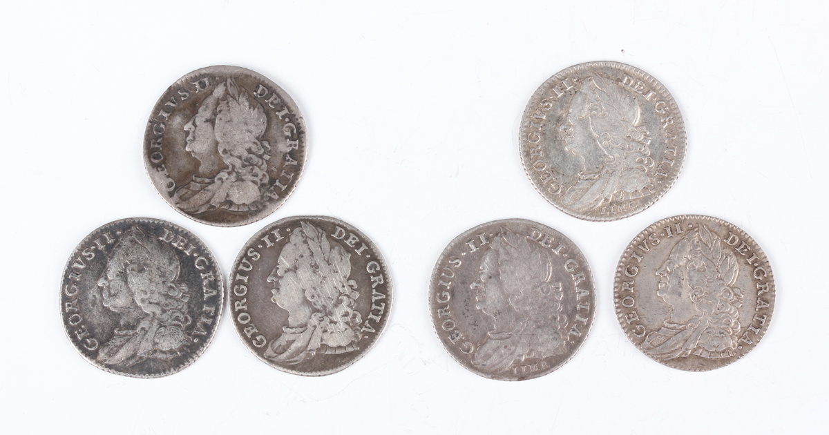 A small group of George II sixpences, including 1745, Lima below bust, Sp 3710, 1746, Lima below bust, Sp 3710A, and 1758, Sp 3711.