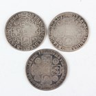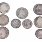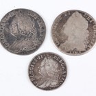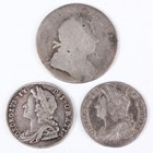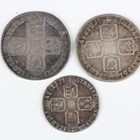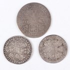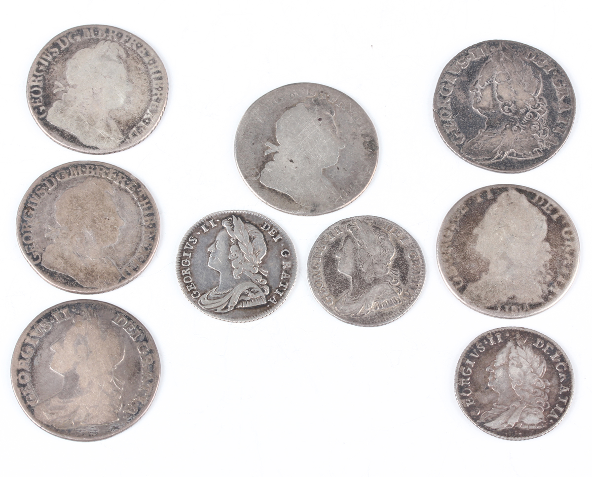 A small group of George I and George II silver coinage, including a sixpence 1728, roses and plumes in angles, Sp 3707, a sixpence 1741, roses in angles, Sp 3708, and a shilling 1718, roses and plumes in angles, Sp 3645.