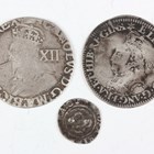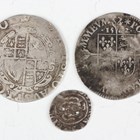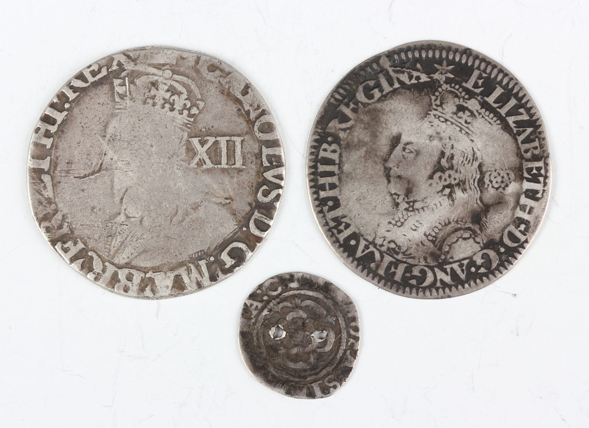An Elizabeth I milled issue sixpence 1558-1603, dated 1562, with large broad bust, mintmark star, Sp 2596 (fair), together with a Charles I hammered silver shilling 1625-1649, mintmark crown, Tower Mint (fair), and a Charles I hammered silver penny (pierced in two places).