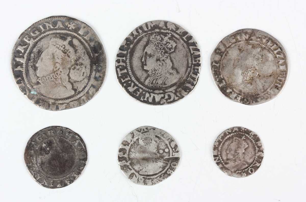 A small group of Elizabeth I hammered silver coinage 1558-1603, including a sixpence, second issue, without date, mintmark martlet, and another sixpence, dated 1574, mintmark eglantine (all fair, toned).