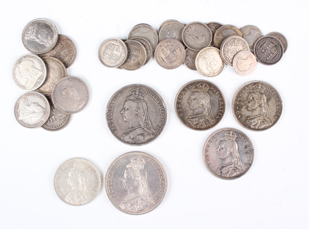 A collection of Victorian silver coinage, including a Jubilee Head crown 1887 and a Jubilee Head florin 1887 (both extremely fine).
