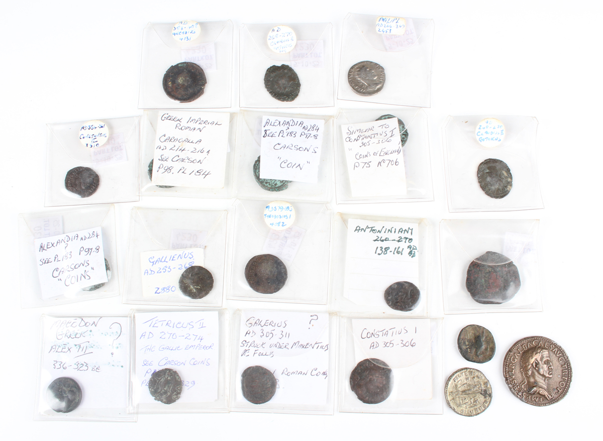 A small collection of Roman and other ancient copper alloy coinage, including a Philip I antoninianus 244-249 AD, reverse with Annona standing left holding cornucopia, two Roman provincial Egyptian coins, probably Severus Alexander, and a Claudius Gothicus radiate, mid to late 2nd century, together with a 20th century facsimile copy of a Galba sestertius.