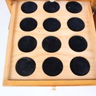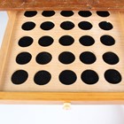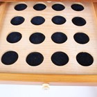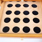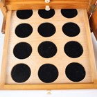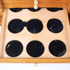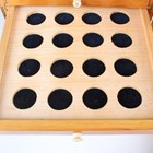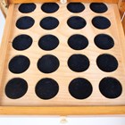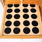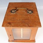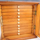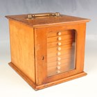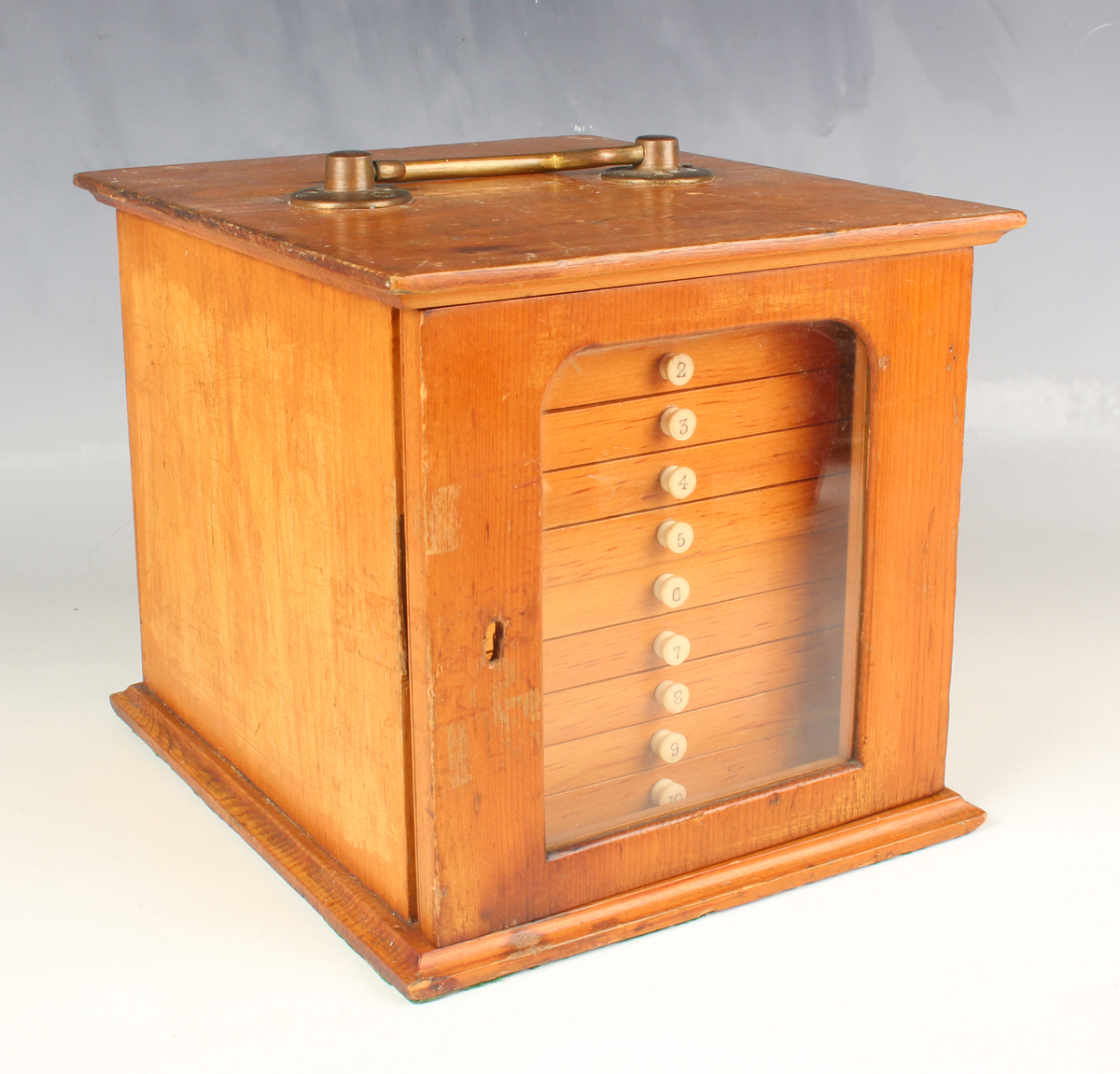 A late 19th/early 20th century pine ten-drawer coin collector's chest with ten sliding trays, each with numbered ivory knops and coin space enclosures from 37mm to 32mm, 25mm, 20mm and 18mm, enclosed by a glazed hinged door, the top with carrying handle, overall height 18cm, width 19cm, depth 22.5cm (lacking lock, marked and blemished overall). Note: a non-transferrable ivory exemption certificate has been granted for the sale of this item.
