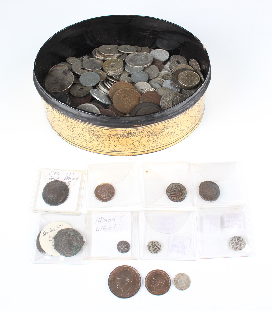 A large collection of European and world coinage, including a Lundy one puffin 1929, a Lundy half-puffin 1929, a Ceylon Victoria ten cents 1894 and a small group of Indian coinage, probably 18th and early 19th century.