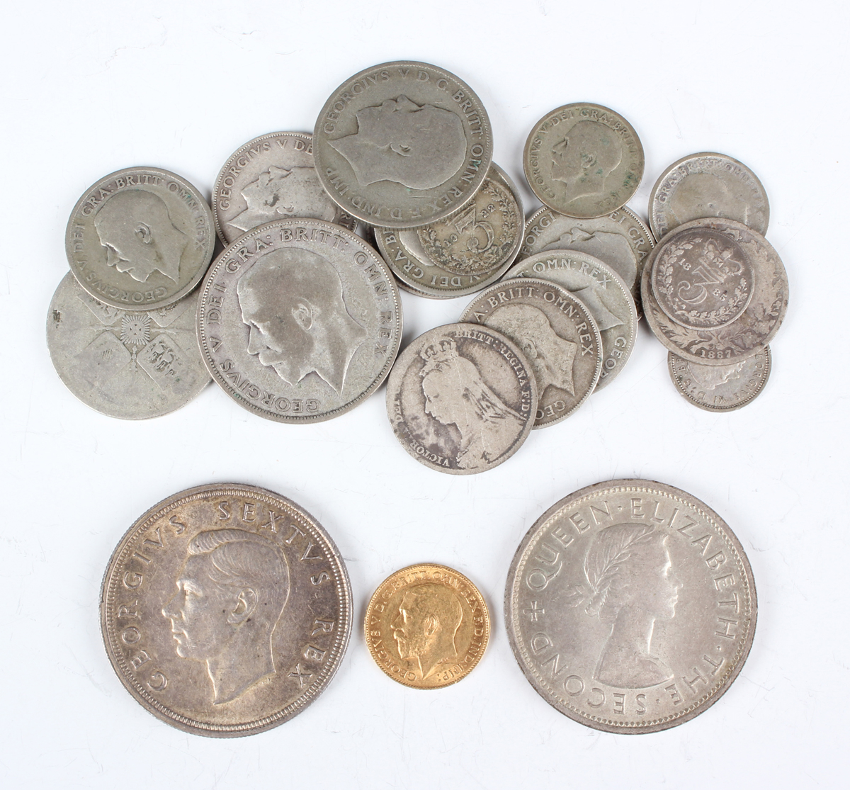 A George V half-sovereign 1913, together with a group of mixed silver and silver nickel coinage, including a half-crown, florins, shillings, sixpences, threepences and a South Africa five shillings 1948.