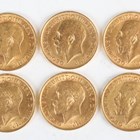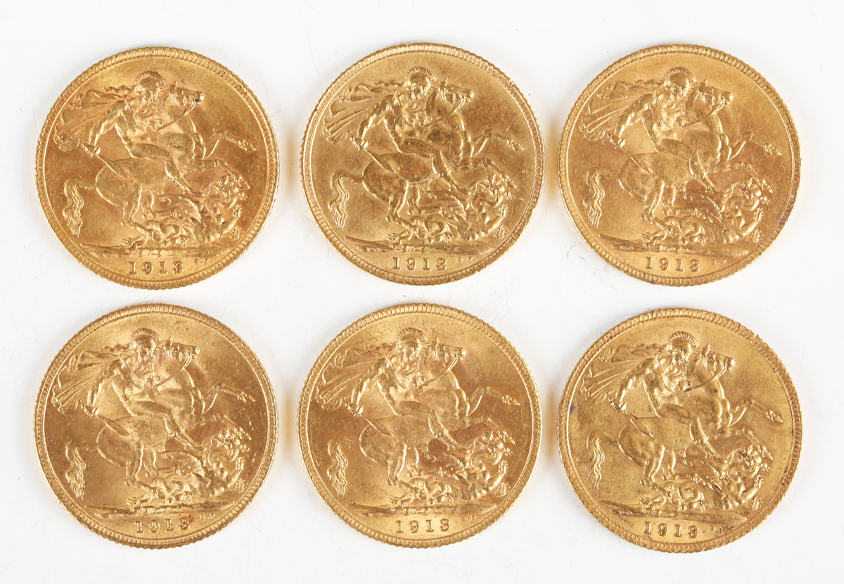 A group of six George V sovereigns, all 1913.