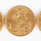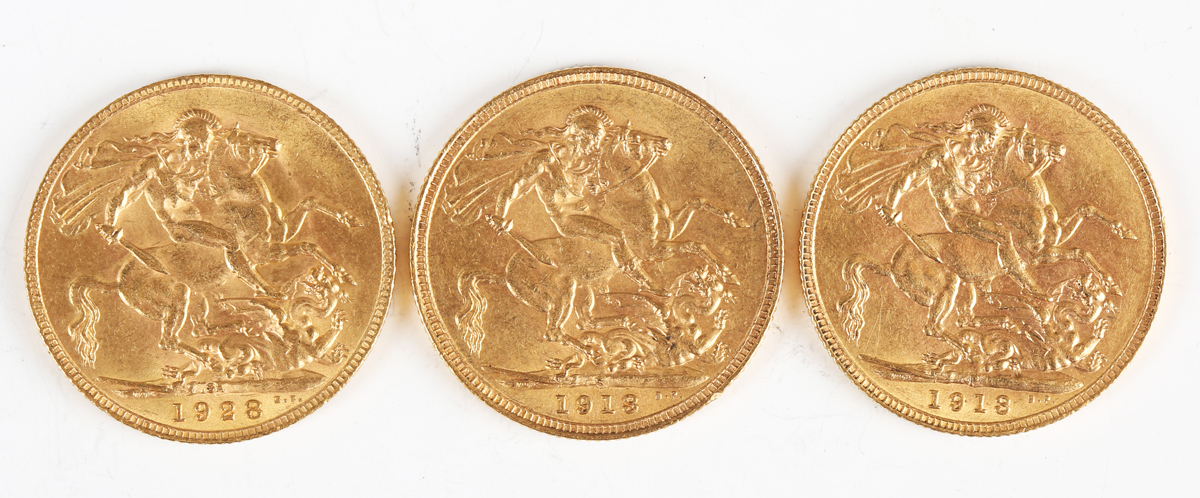 A group of three George V sovereigns, comprising 1913 Perth Mint, 1913 Sydney Mint and 1928 South Africa Mint.
