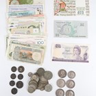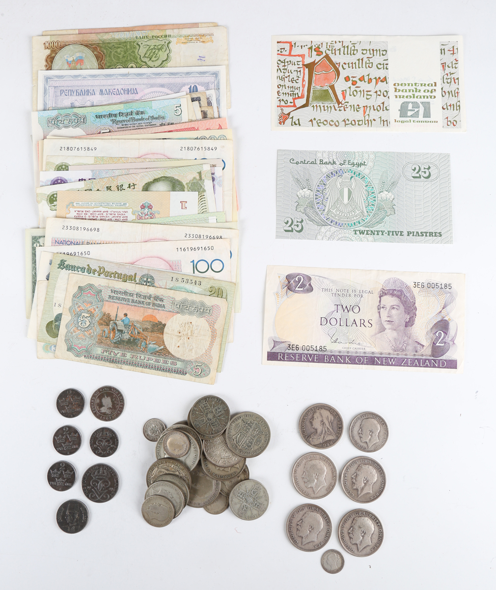 A large collection of European and world coins and banknotes, including a group of British silver and silver nickel coinage, including half-crowns, florins, shillings and sixpences, a Reserve Bank of New Zealand two dollars, a Central Bank of Egypt twenty-five piastres and a Central Bank of Ireland one pound.