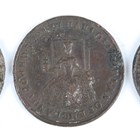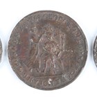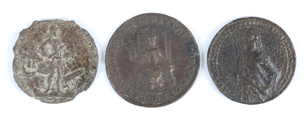 An 18th century cast pinchbeck medallion celebrating the Coronation of George III, obverse with King enthroned being crowned by an archbishop, reverse with Queen Charlotte enthroned holding orb and sceptre, Eimer 693, together with two similarly cast pinchbeck medallions celebrating Admiral Vernon's capture of Portobello, circa 1739 (one with environmental damage and losses to edges, the other with bubbling to fields).