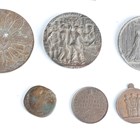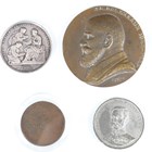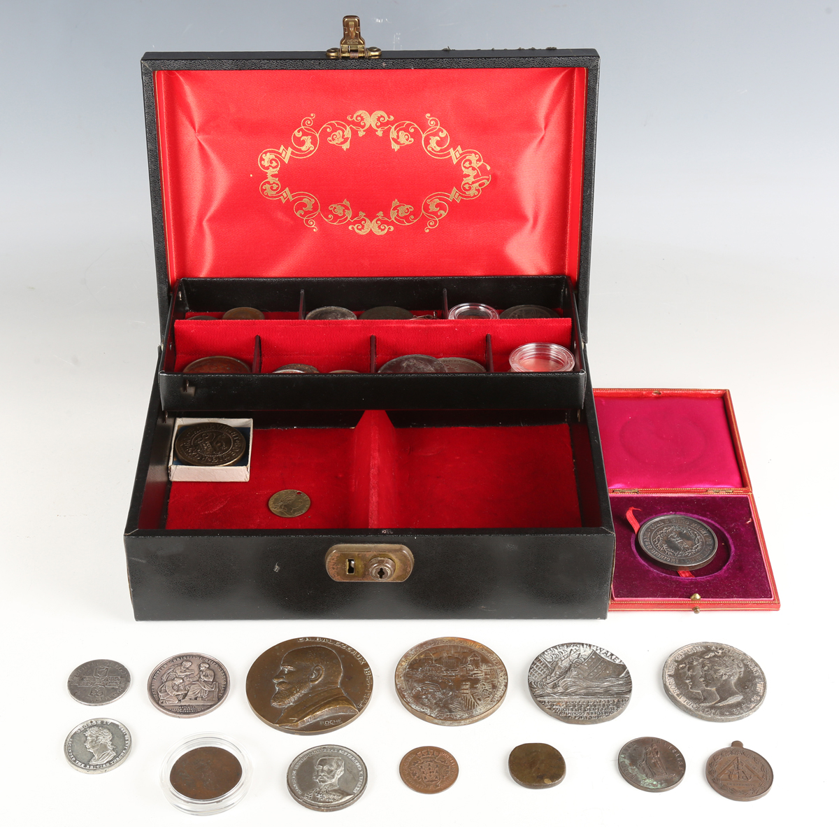 A collection of European and world medallions and coins, including an Anne half-crown 1709, a Papal States silver medallion, detailed with bust of Pius IX, dated 1862, a large silver plated medal, awarded to Lewis D. Cave by the London University, Matriculation June 1885, and a Roman Empire Antoninus Pius bronze sestertius 138-161 AD (worn).