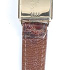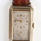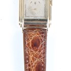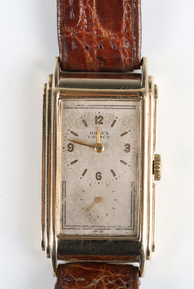 A Rolex Prince 9ct gold railway cased gentleman's wristwatch, Ref. 1527, the signed and jewelled manual wind movement numbered '1882149', the signed silvered rectangular dial with gilt Arabic numeral and baton hour markers and subsidiary seconds, the rectangular case with stepped sides, the snap-on back numbered '6892' over '1527' and presentation engraved, with signed case back interior, import mark Glasgow 1931, case width 2.2cm, case length including lugs 4.2cm, on a brown leather strap with Rolex buckle.
