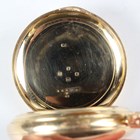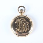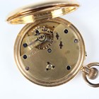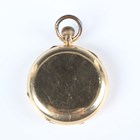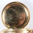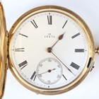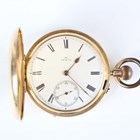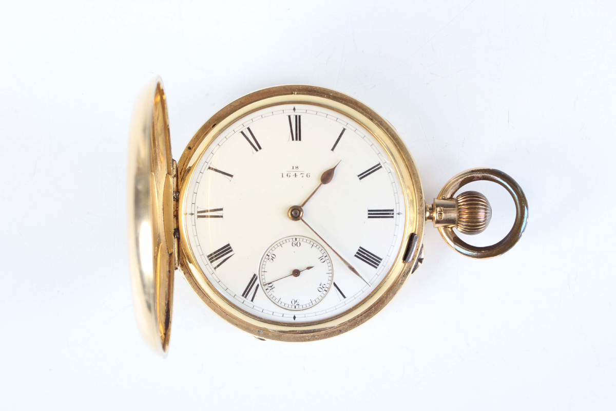 An 18ct gold hunting cased keyless wind gentleman's pocket watch with unsigned jewelled gilt three-quarter plate movement, the white enamelled dial with black Roman hour numerals and subsidiary seconds, detailed '18' over '16476', gold inner case, the case front monogram engraved, London 1892, total weight 115.6g, case diameter 5cm.