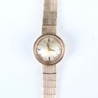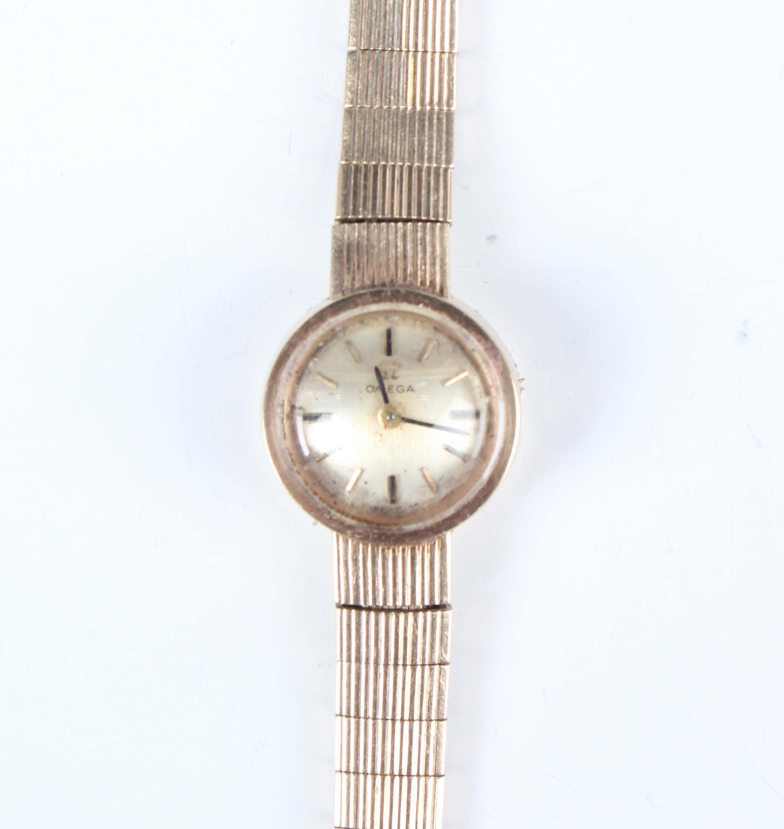An Omega 9ct gold circular cased lady's bracelet wristwatch, the signed silvered dial with gilt baton hour markers, the tapered link bracelet with foldover clasp, London 1971, total weight 20g, total length 18.3cm (winding button missing).