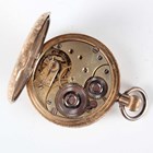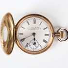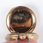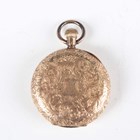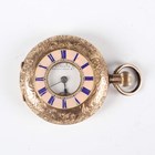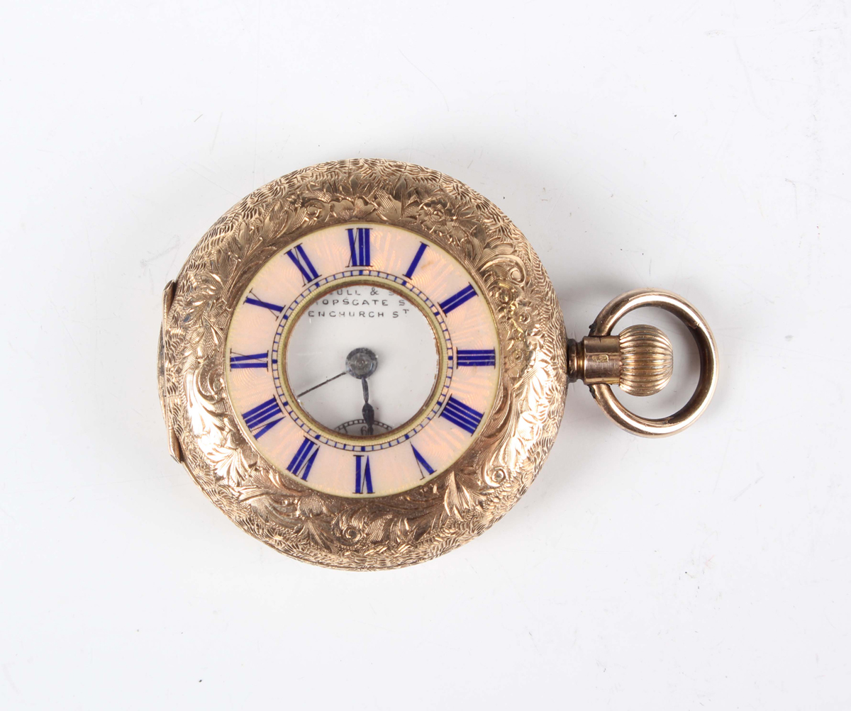 A 14K gold half-hunting cased keyless wind lady's fob watch with unsigned movement, the white enamelled dial with black Roman hour numerals, subsidiary seconds and detailed 'W. Bull & Son...', gilt metal inner case, the foliate engraved case with apricot chapter ring and blue Roman hour numerals, case back interior detailed '14K', total weight 33.5g, case diameter 3.4cm.